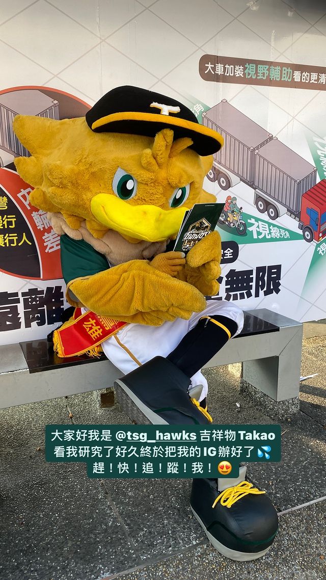 本季將開始中華職棒一軍賽事的新球隊台鋼雄鷹最近行銷動作不斷,不只積極在如黃色小鴨展區等各大活動場合曝光,親民的街頭路邊宣傳也進行了兩次,而身負行銷重任的吉祥物TAKAO今天也宣布開通個人IG帳號,希望吸引更多粉絲支持在地球隊。